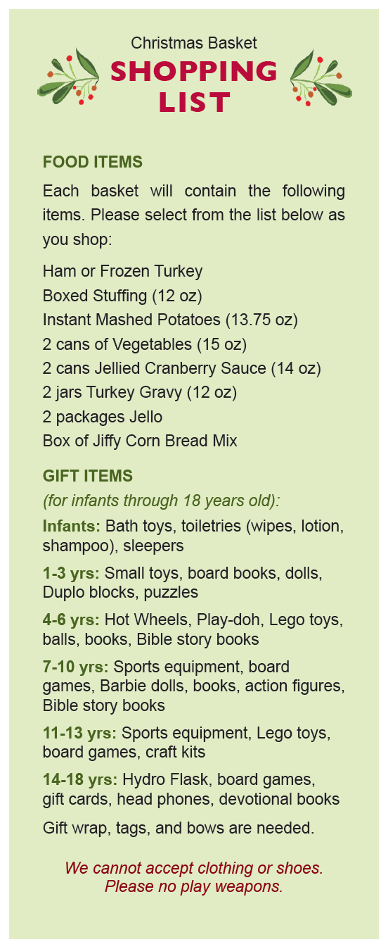 We are now accepting donations of food and gift items to be placed in Christmas baskets and given to families in our fellowship at Christmas time. These families may have been affected by severe financial hardship, a recent layoff, illness, or other temporary circumstances that hinder their ability to provide the extras for the Christmas season. We have provided a list of suggestions for food and gift items you may purchase and donate.