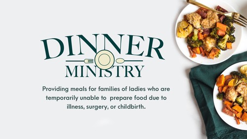 Dinner Ministry provides meals for families of ladies who have given birth, undergone surgery, or are experiencing an illness. Please contact us if you find yourself in need of help from this ministry. If you would like to get more information about becoming a part of serving in the Dinner Ministry,